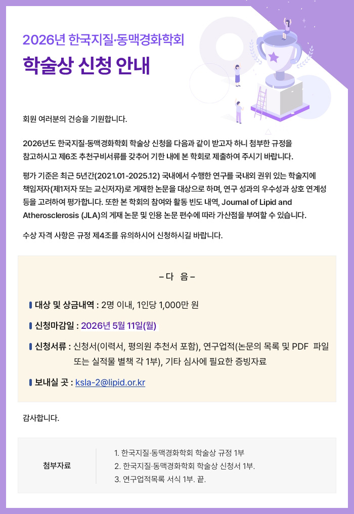 2026년 한국지질·동맥경화학회 학술상 신청 안내의 건(~5/11)