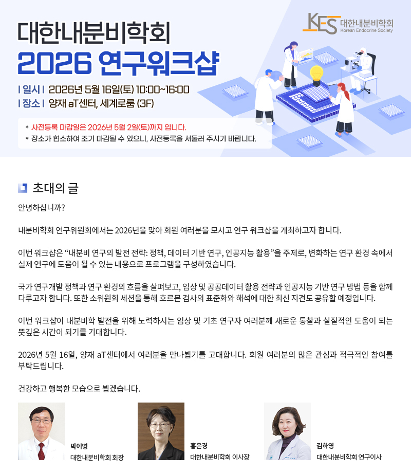 대한내분비학회에서는 오는 5월 16일 2026년 연구워크숍을 양재aT센터 세계로룸에서 개최할 예정입니다.