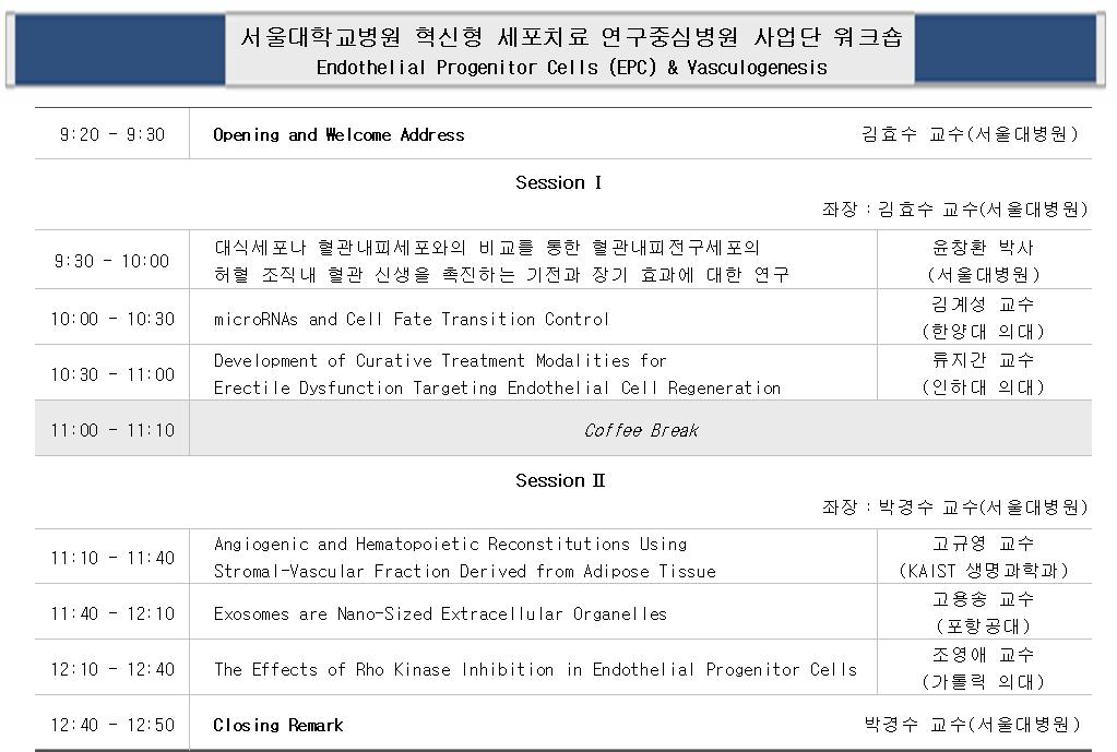 서울대학교병원 혁신형 세포치료 연구중심병원 사업단에서는 Endothelial Progenitor Cells(EPC) & Vasculogenesis 라는 주제로 다음과 같이 Workshop을 개최합니다. 관심있는 분들의 많은 참여 바랍니다.