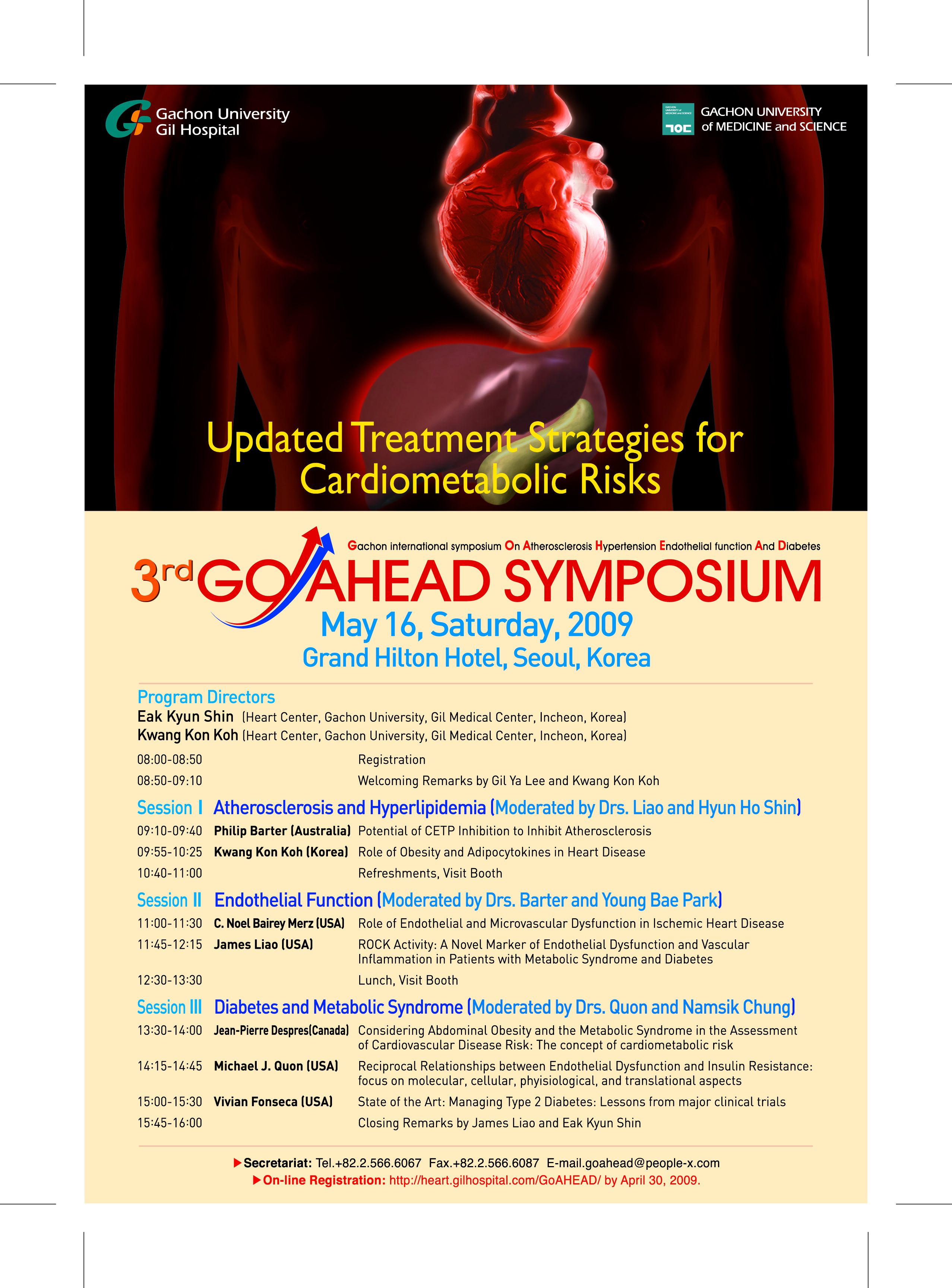 오전에는 고지혈증 분야로 HDL의 대가이며 2008년 NEJM 논문을 비롯하여 많은 대단위 임상연구에 참여한 Barter 교수, 내피세포 기능 분야로 NIH 후원의 대규모 연구인 WISE의 책임연구자이며 Dr. Grundy와 함께 NCEP ATP III 위원회의 부위원장인 Bairey Merz교수와 스타틴의 Pleiotropic effect를 정립하고 최근 Rho Kinase 활성화의 임상적 연구 활용을 정립하고 Circulation Research의 Editor-in-Chief로 거론되고 있는 Liao 교수, 오후에는 당뇨와 대사성증후군 분야로 복부 비만의 중요성을 Nature 등에 처음 보고한 Despres 교수, 인슐린저항성 지수인 QUICKI의 창안자인 Quon 박사, 현재 미국당뇨학회지인 Diabetes Care Editor-in-Chief인 Fonseca 교수를 모시게 되었습니다. 임상의학자, 기초연구자, 의대학생 및 관련 전문가들에게 좋은 자리가 될 것으로 생각합니다.