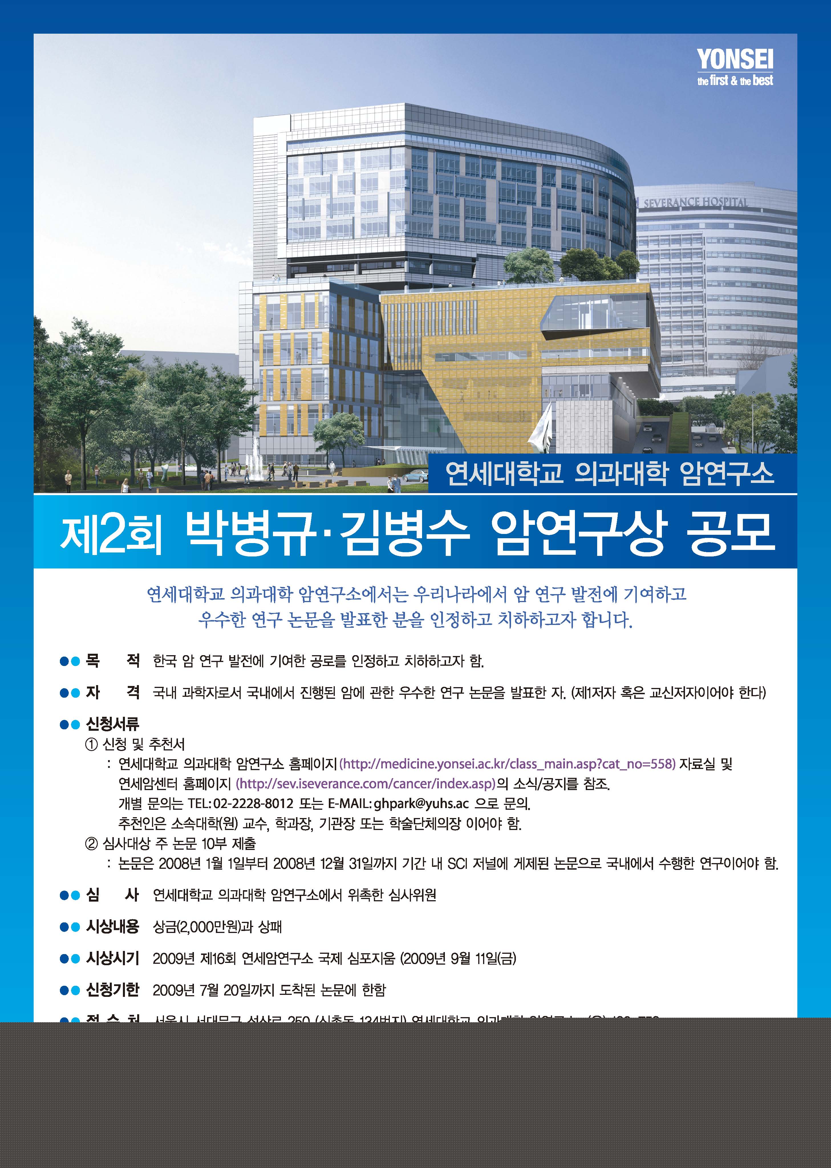 [학회 관련 연구상 공모 안내] 제2회 박병규, 김병수 암연구상 공모(연세대학교 의과대학 암연구소장)