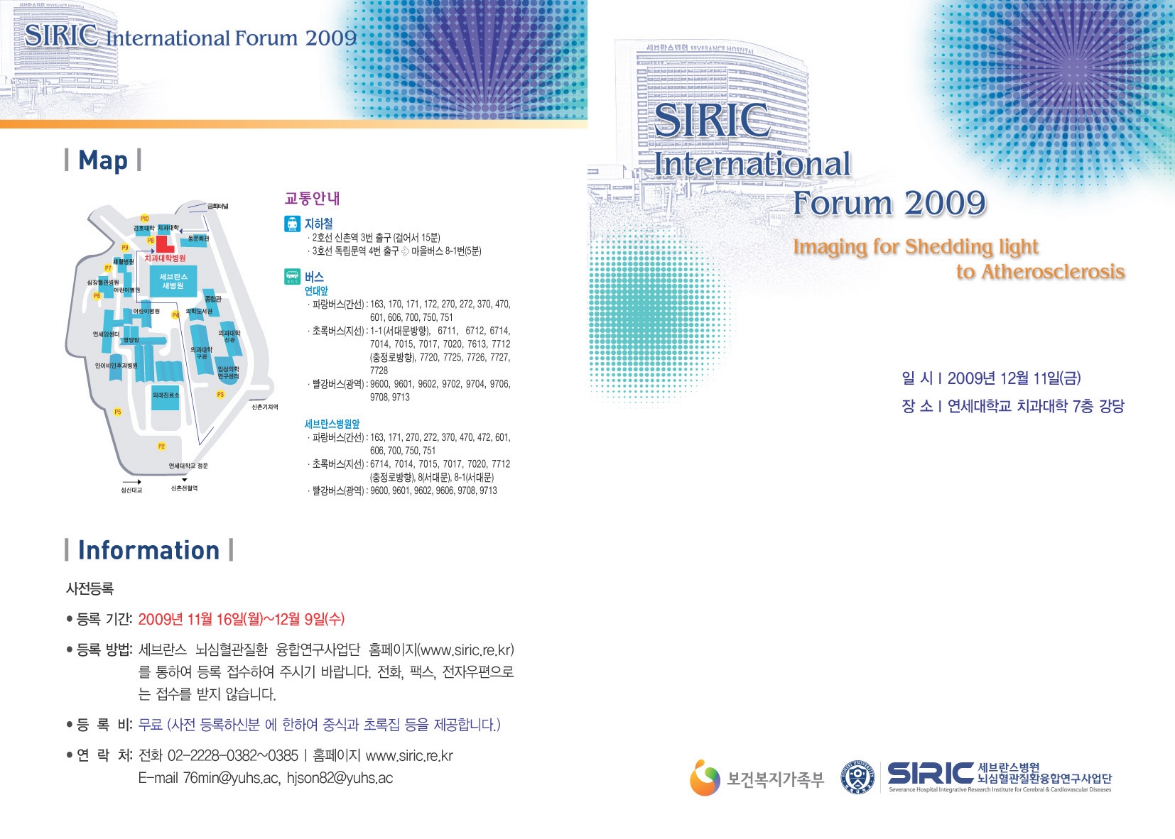 세브란스병원 뇌심혈관질환융합연구사업단(SIRIC)에서 2009년 12월 11일 “The SIRIC International Forum 2009 : Imaging for Shedding Light to Atherosclerosi”를 개최합니다.