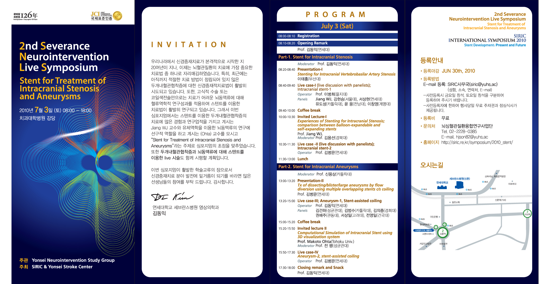 그래서 이번 심포지엄에서는 스텐트를 이용한 두개내혈관협착증의 치료에 많은 경험과 연구업적을 가지고 계시는 Jiang WJ 교수와 유체역학을 이용한 뇌동맥류의 연구에 선구적 역할을 하고 계시는 (Ohta) 교수를 모시고 “Stent for Treatment of Intracranial Stenosis and Aneurysms”라는 주제로 심포지엄의 초점을 맞추었습니다.또한 두개내혈관협착증과 뇌동맥류에 대해 스텐트를 이용한 live 시술도 함께 시행할 계획입니다.