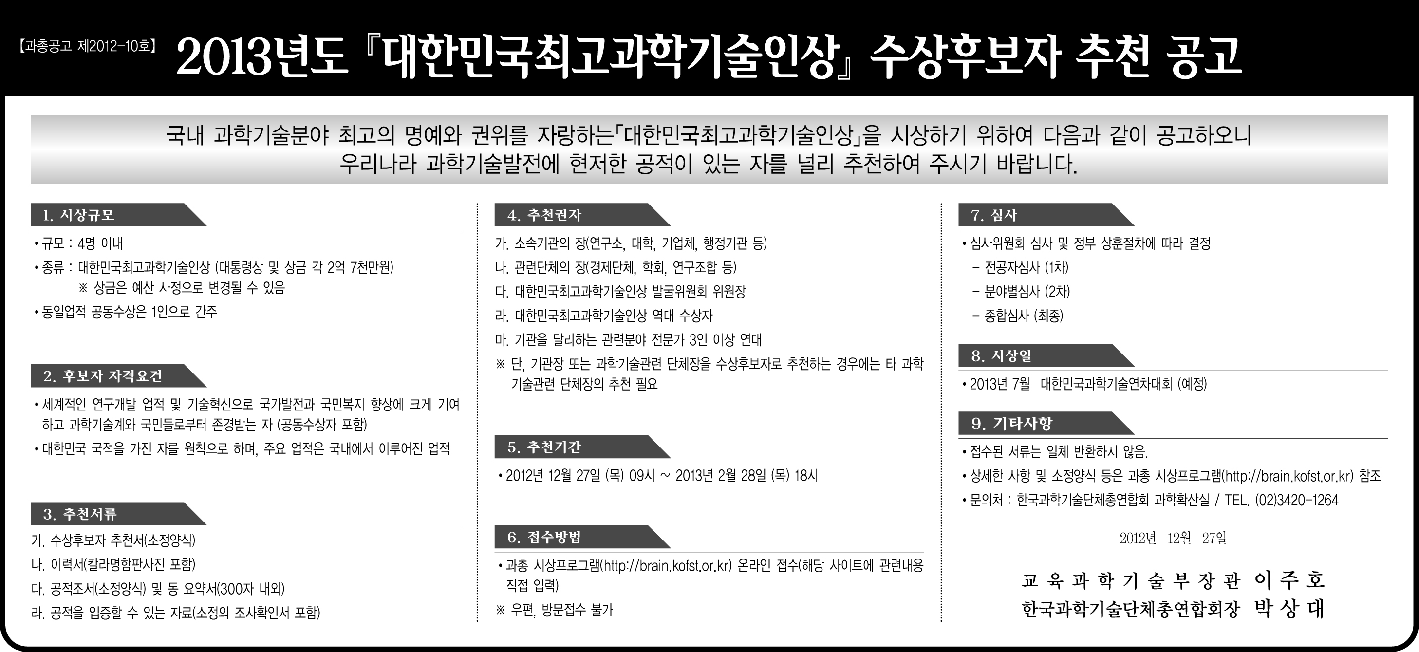 2013년도 대한민국최고과학기술인상 수상후보자 추천 공고