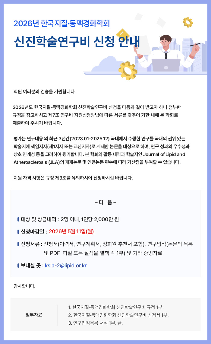 2026년 한국지질·동맥경화학회 신진학술연구비 신청 안내의 건(~5/11)