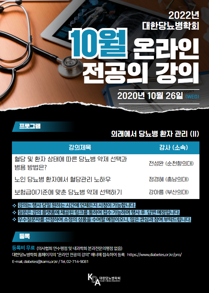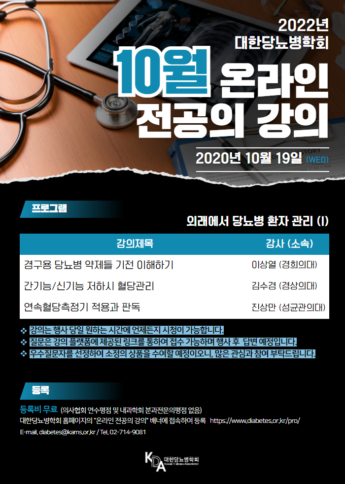 대한당뇨병학회에서 2022년 10월 2차례의 온라인 전공의 강의를 개최합니다.