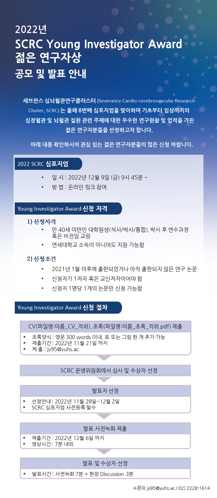 세브란스에서는 SCRC 심포지엄 관련 젊은 연구자상을 공모합니다. 자세한 내용은 아래 내용 참고 부탁드립니다.