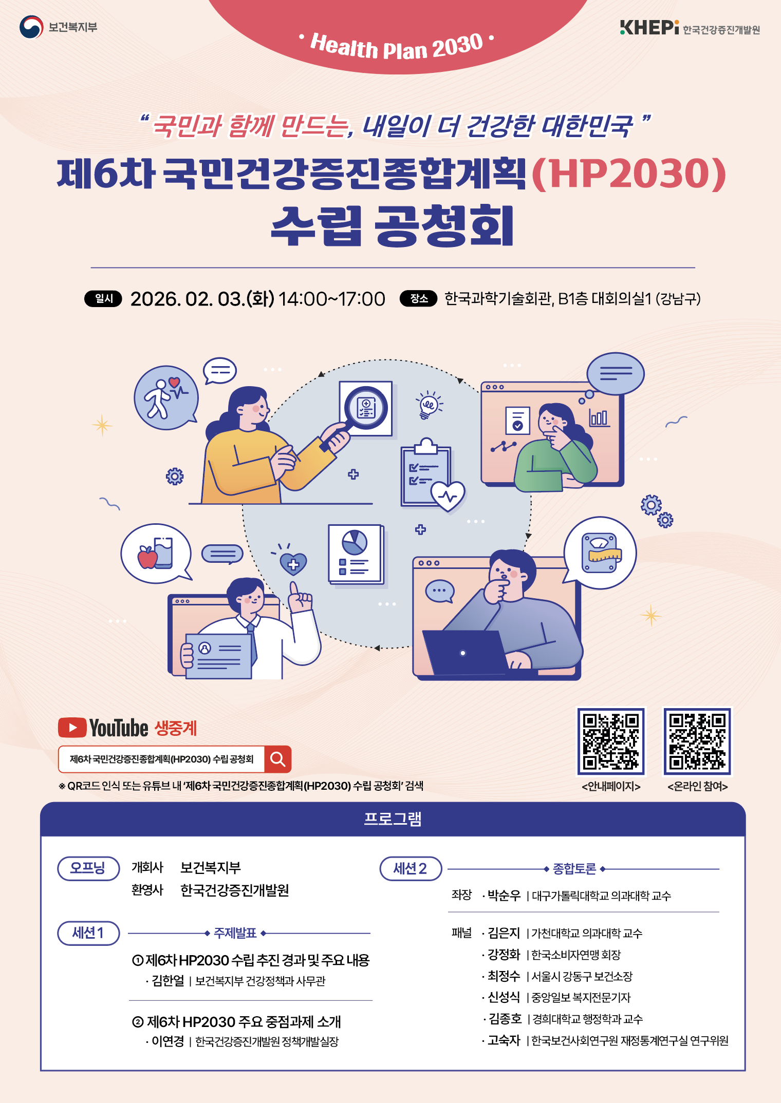 한국건강증진개발원에서는 2026~2030년까지 추진될 제6차 국민건강증진종합계획(HP2030)의 초안을 발표하고 대중의 의견수렴을 위해 제6차 HP2030 수립 공청회를 개최합니다.